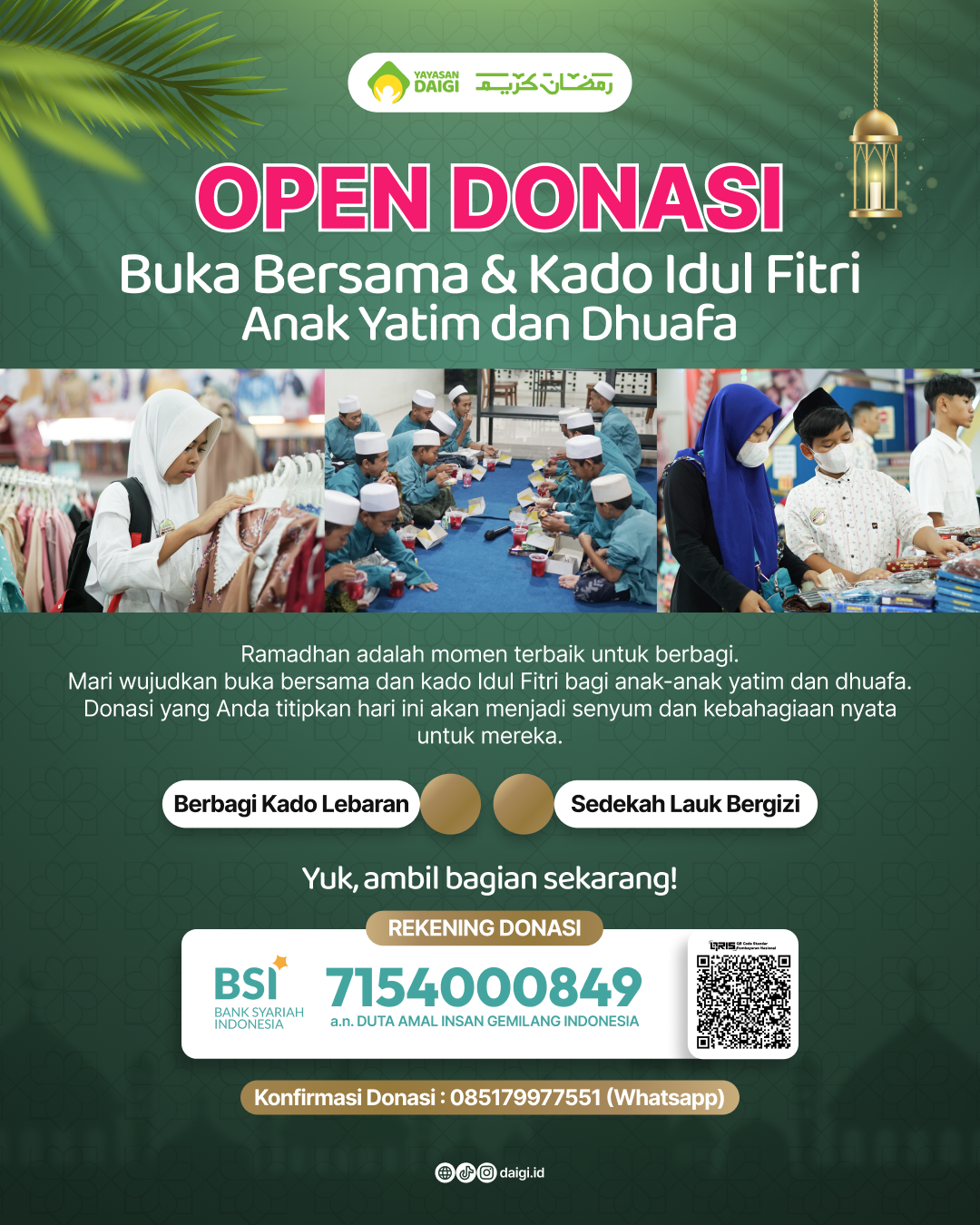 1. Transfer ke rekening Bank Bank Syariah Indonesia (BSI) No. Rek 7154000849 a.n Duta Amal Insan Gemilang Indonesia